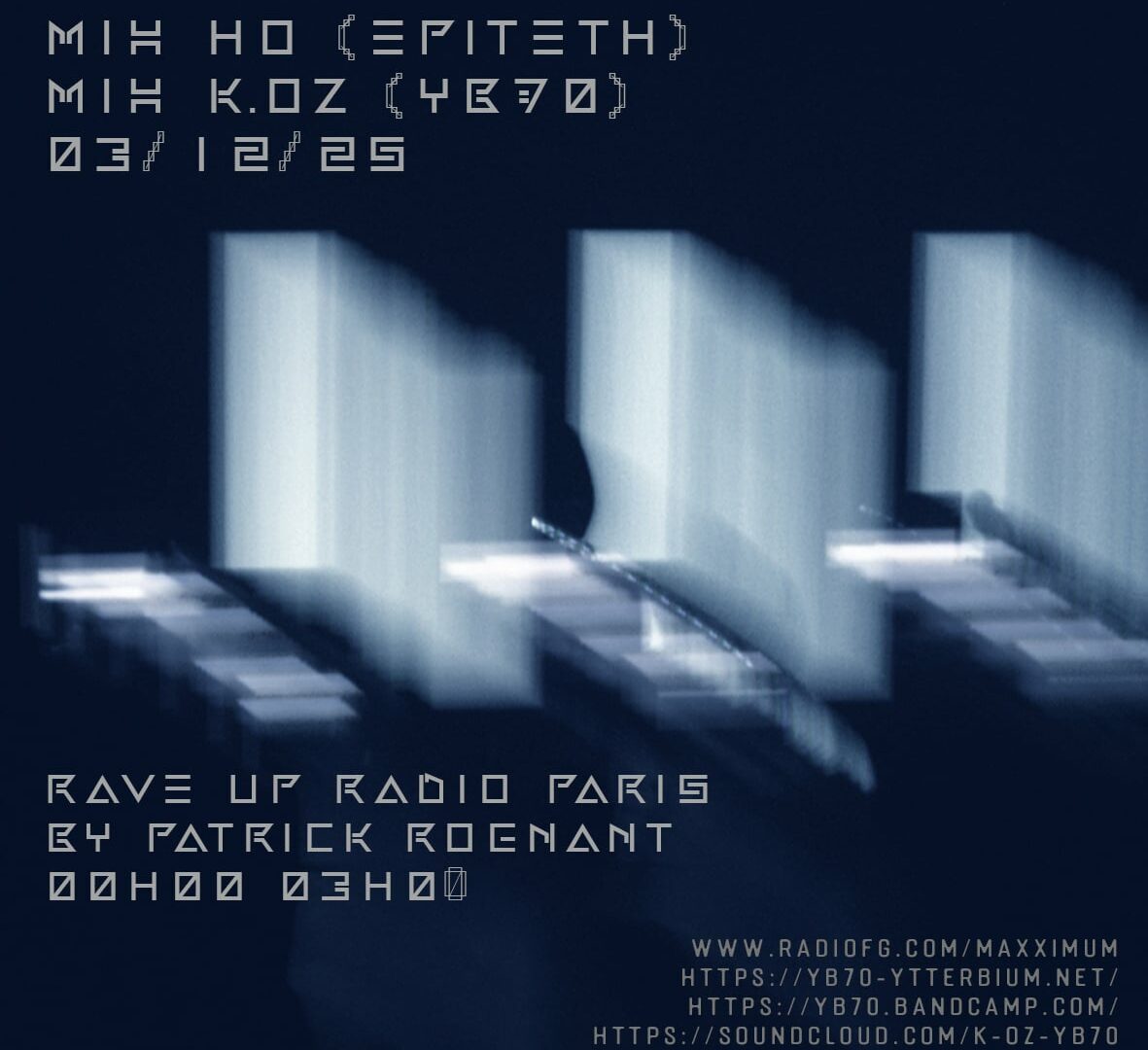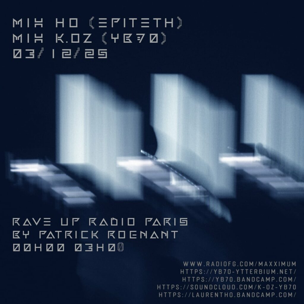 K.Oz – Rave Up – 03-12-2025 K.Oz (Yb70) – Ho (Epiteth) – Rave up radio show Paris. www.radiofg.com/maxximum – 00h00 / 03h00 Skip back to main navigation